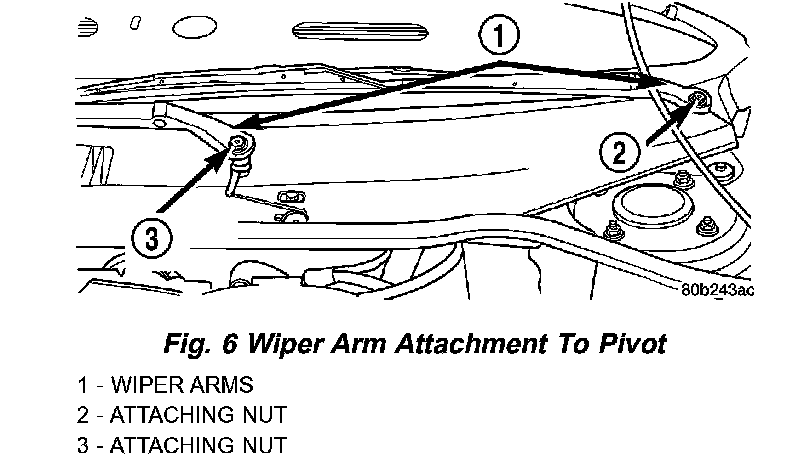 6. Remove caps from both wiper arms at the attachment to the pivots to expose the wiper arm attaching nut. Remove the nut attaching each wiper arm to its pivot.