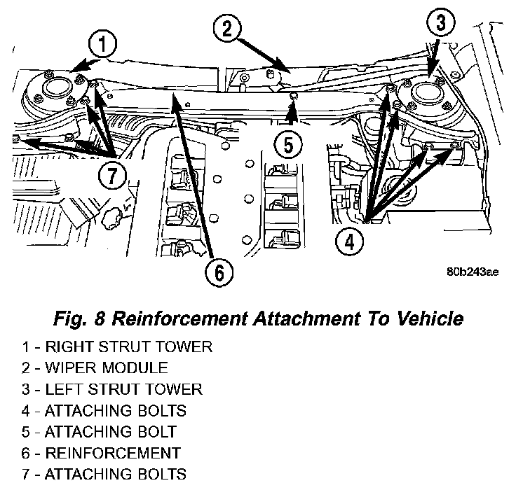 9. Remove the eight bolts attaching the cowl reinforcement to the strut towers and the one bolt attaching the wiper module to the reinforcement. Remove the reinforcement from the vehicle.