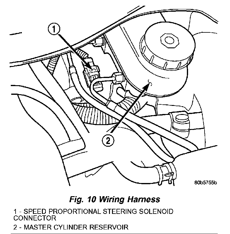 11. If the steering gear being removed from the vehicle is a speed proportional steering gear, disconnect the wiring harness connector from the solenoid control valve electrical connector. The connector is located on the steering gear end cap below the brake master cylinder..