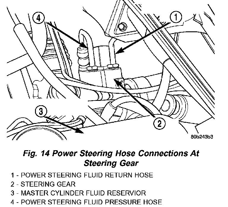 19. Remove the power steering fluid pressure hose and return hose from the steering gear.