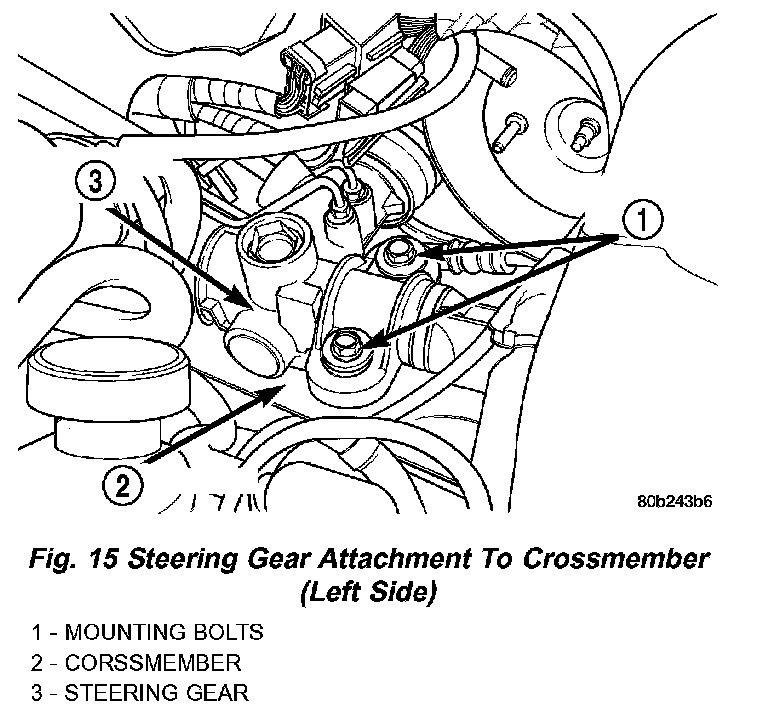20. Remove the two bolts attaching the left side of the steering gear to the crossmember.