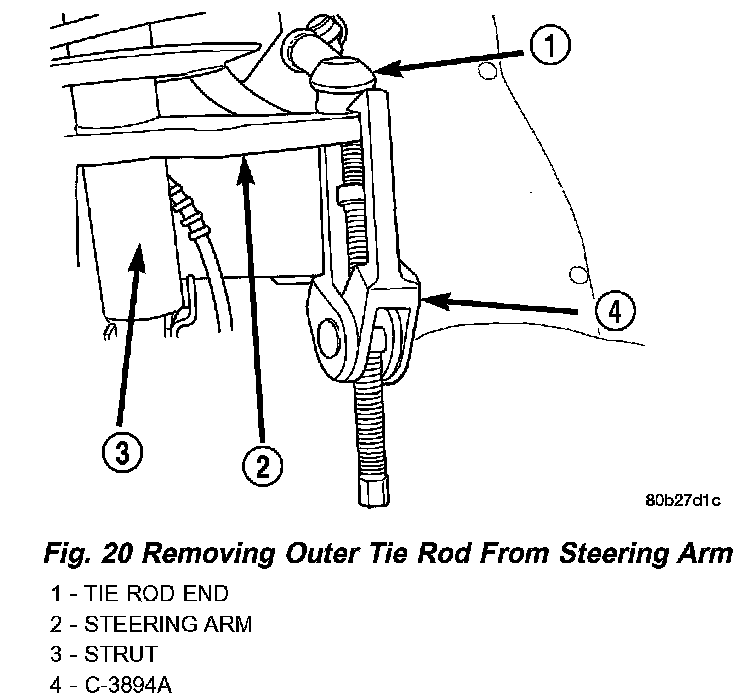 28. Remove the tie rod end from the steering arm of the strut using Puller, Special Tool C-3894-A.