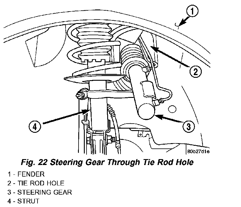 NOTE: If the vehicle is equipped with a 2.7 liter engine, rotate the front of the left front tire/wheel as far outward as possible. This is necessary to have the required clearance to allow the removal of the steering gear from a vehicle with this engine application.