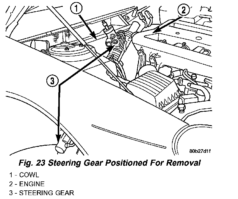 b. Lift the left end of the steering gear upward, with the steering gear positioned as shown, between the back of the engine and the front of the cowl.