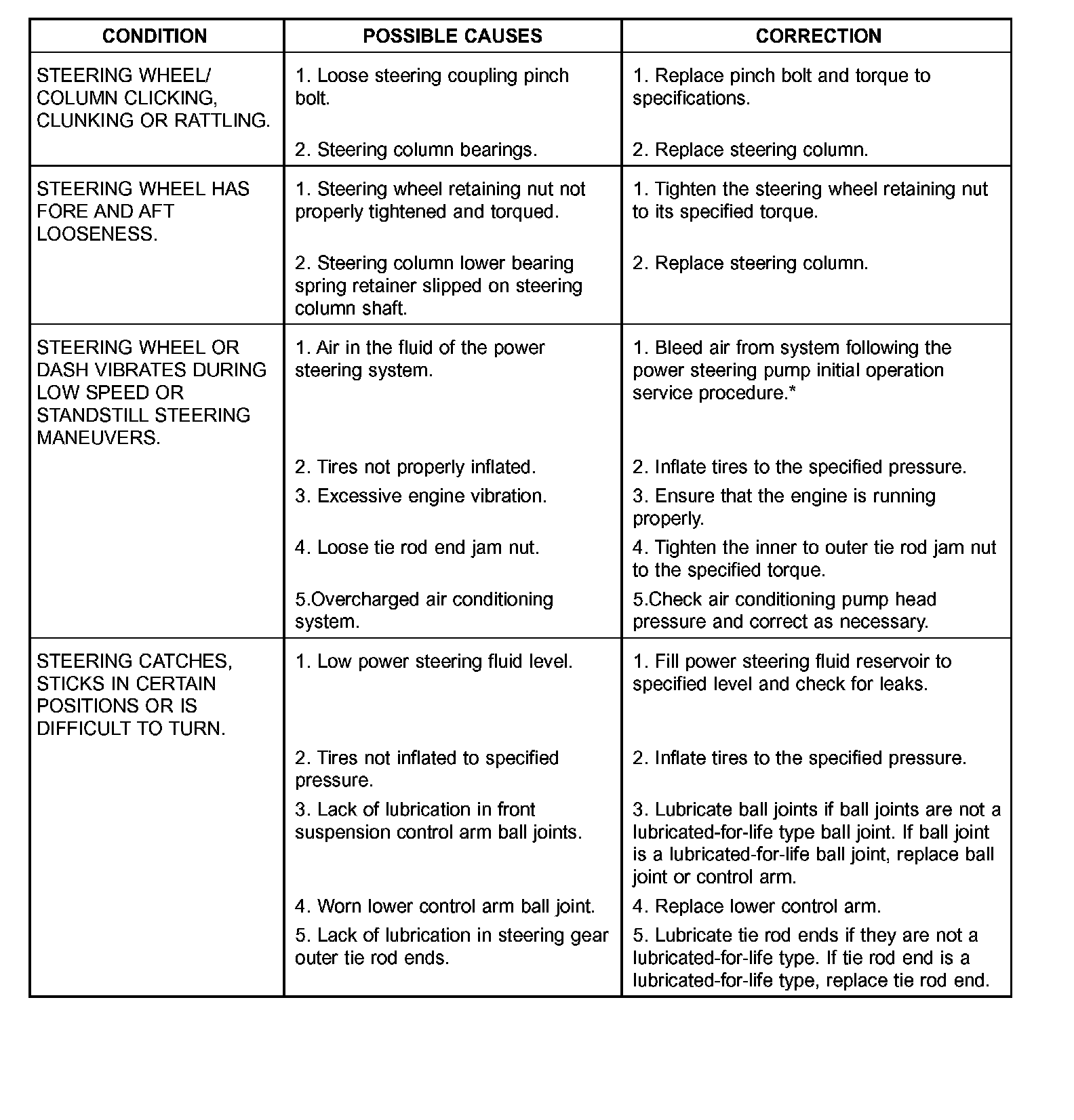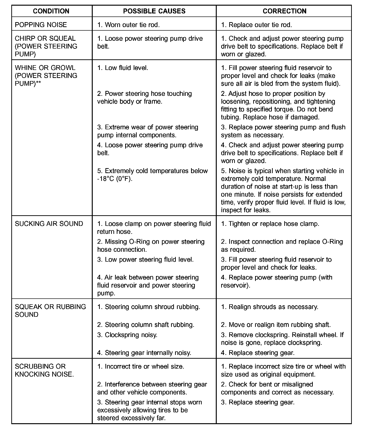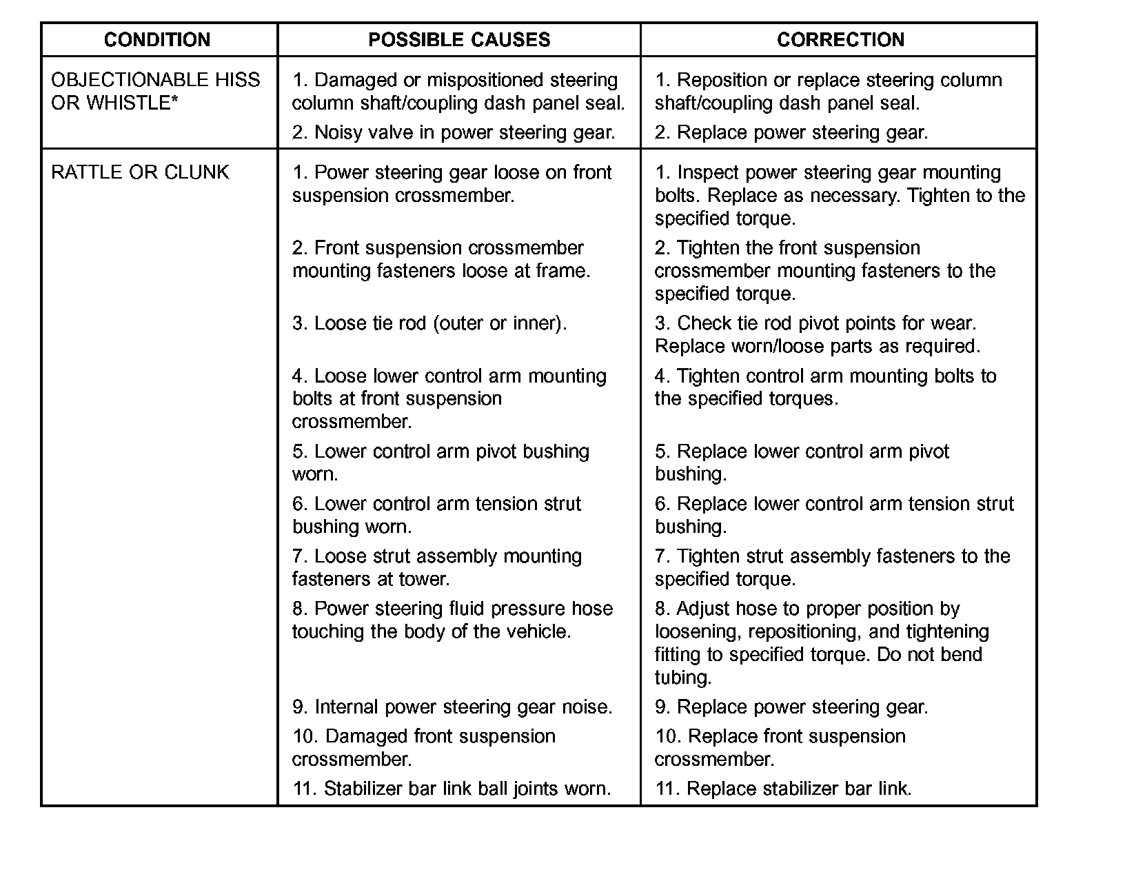 *NOTE: There is some noise in all power steering systems. One of the most common is a hissing sound evident when turning the steering wheel when at a standstill or when parking and the steering wheel is at the end of its travel. Hiss is a very high frequency noise similar to that experienced while slowly closing a water tap. The noise is present in every valve and results when high velocity fluid passes valve orifice edges. There is no relationship between this noise and the performance of the steering system.