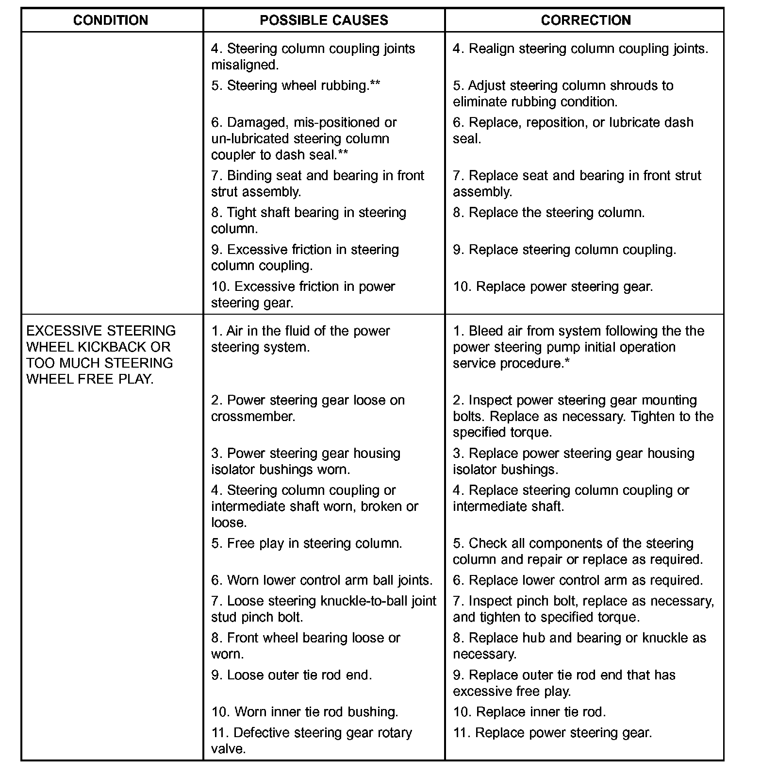 ** NOTE: To evaluate this condition, it may be necessary to disconnect the coupling at the base of the steering column. Turn the steering wheel and feel or listen for internal rubbing in steering column. To avoid damaging the column clock spring, note the following. Before disconnecting coupling, place tires in the straight-ahead position and center steering wheel. Once disconnected, DO NOT rotate steering wheel more than one revolution in either direction and place steering wheel in original location before reconnecting coupling. If this position is lost, the steering column clock spring must be recentered following the procedure found within the procedure for steering column installation.
