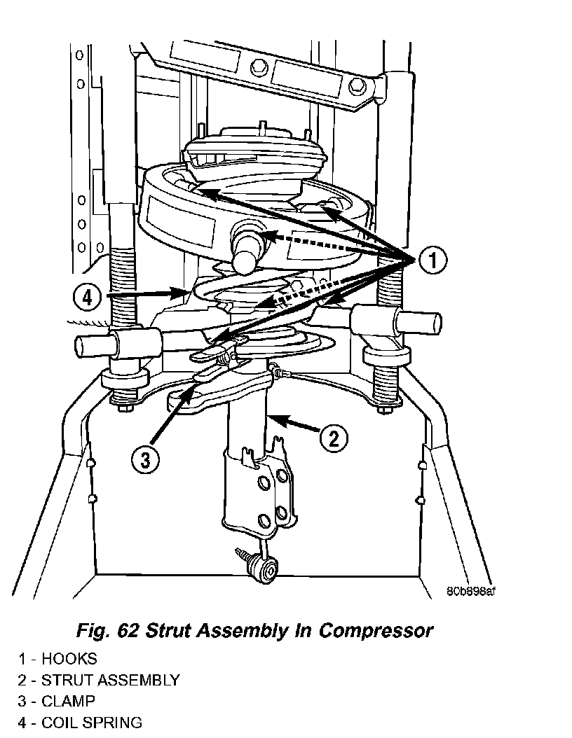 For the disassembly and assembly of the strut assembly, use strut spring compressor, Pentastar Service Equipment (PSE) tool W-7200, or the equivalent, to compress the coil spring. Follow the manufacturer's instructions closely.