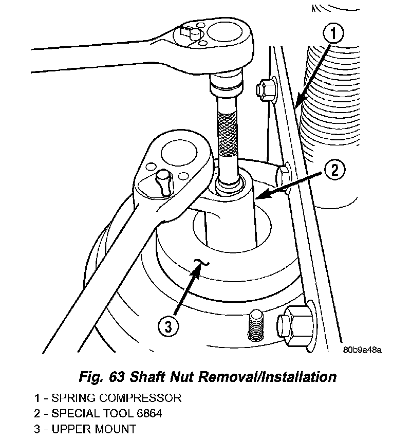 WARNING: DO NOT REMOVE THE STRUT SHAFT NUT BEFORE THE COIL SPRING IS COMPRESSED. THE COIL SPRING IS HELD UNDER PRESSURE AND MUST BE COMPRESSED, REMOVING SPRING TENSION FROM THE UPPER MOUNT AND PIVOT BEARING, BEFORE THE SHAFT NUT IS REMOVED.
