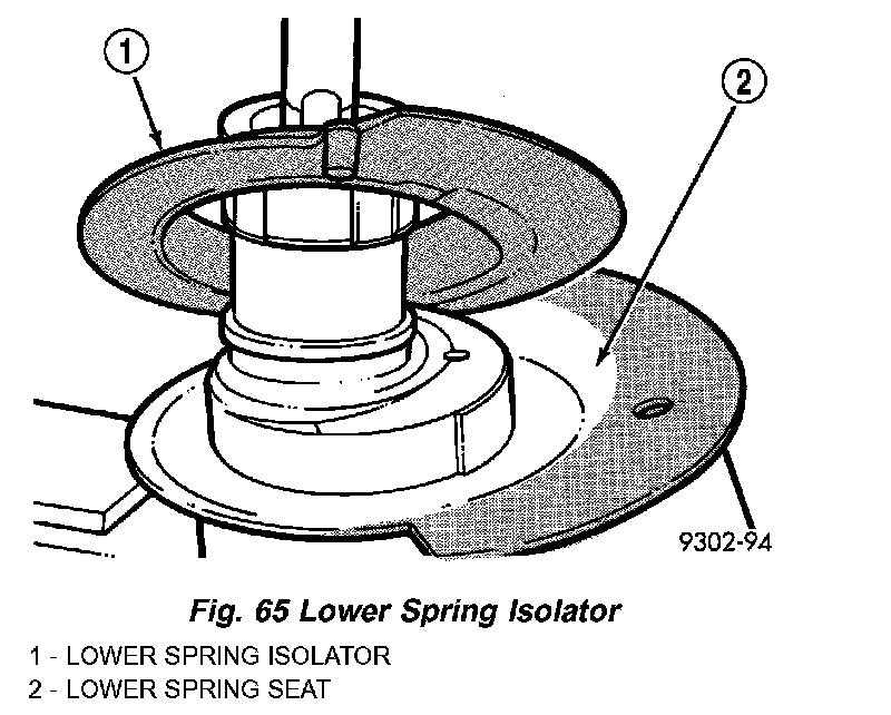 - Before removal of the seat and bearing from the spring, note the flat on the inboard side of the seat and bearing outer perimeter. This must align with the inboard side of the strut (or rear of the clevis bracket) on reassembly. Also note the coil spring ending at the stop built into the seat and upper isolator.