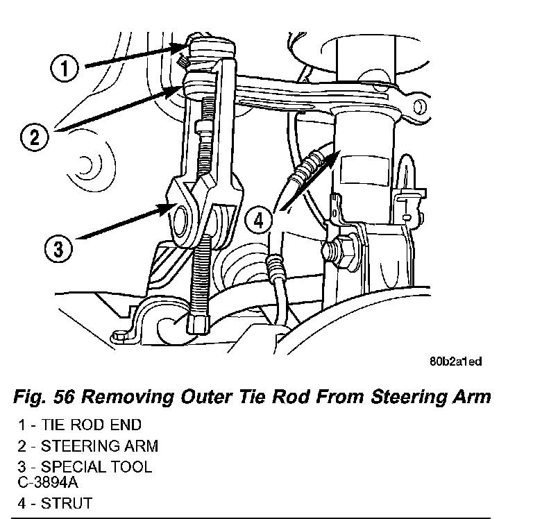 4. Loosen, but do not remove, the outer tie rod end to strut arm attaching nut. Release outer tie rod end from steering arm using Puller, Special Tool C-3894A, then remove nut and tie rod from the steering arm.