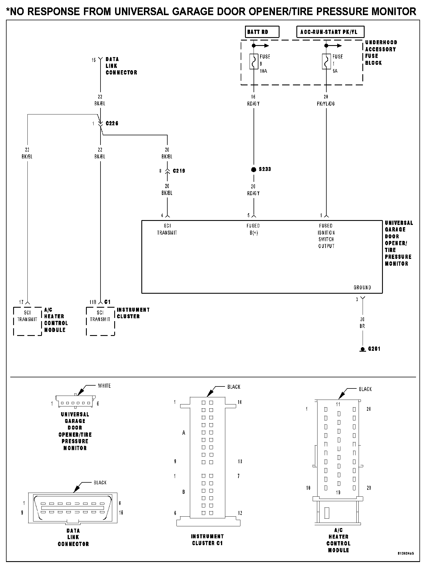 - The Instrument Cluster, Universal Garage Door Opener/Tire Pressure Monitor, A/C Heater Control Module, and Power Top Control Module (if equipped) all use the SCI Transmit circuit at DLC cavity 15 to communicate with the DRB III(R). If one of these modules keeps the SCI Transmit circuit artificially high or low, the DRB III(R) will not be able to communicate with any of the four modules.