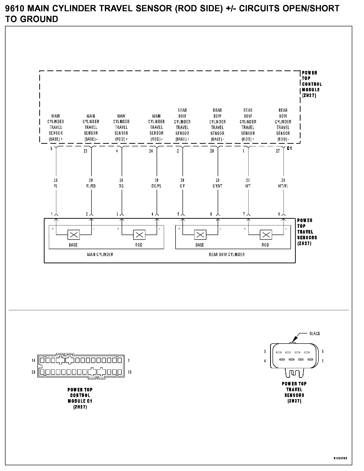 YES: Repair the Main Cylinder Travel Sensor (Rod Side) (-) circuit for a short to ground. Perform POWER TOP CONTROL MODULE VERIFICATION TEST. Power Top Verification Test