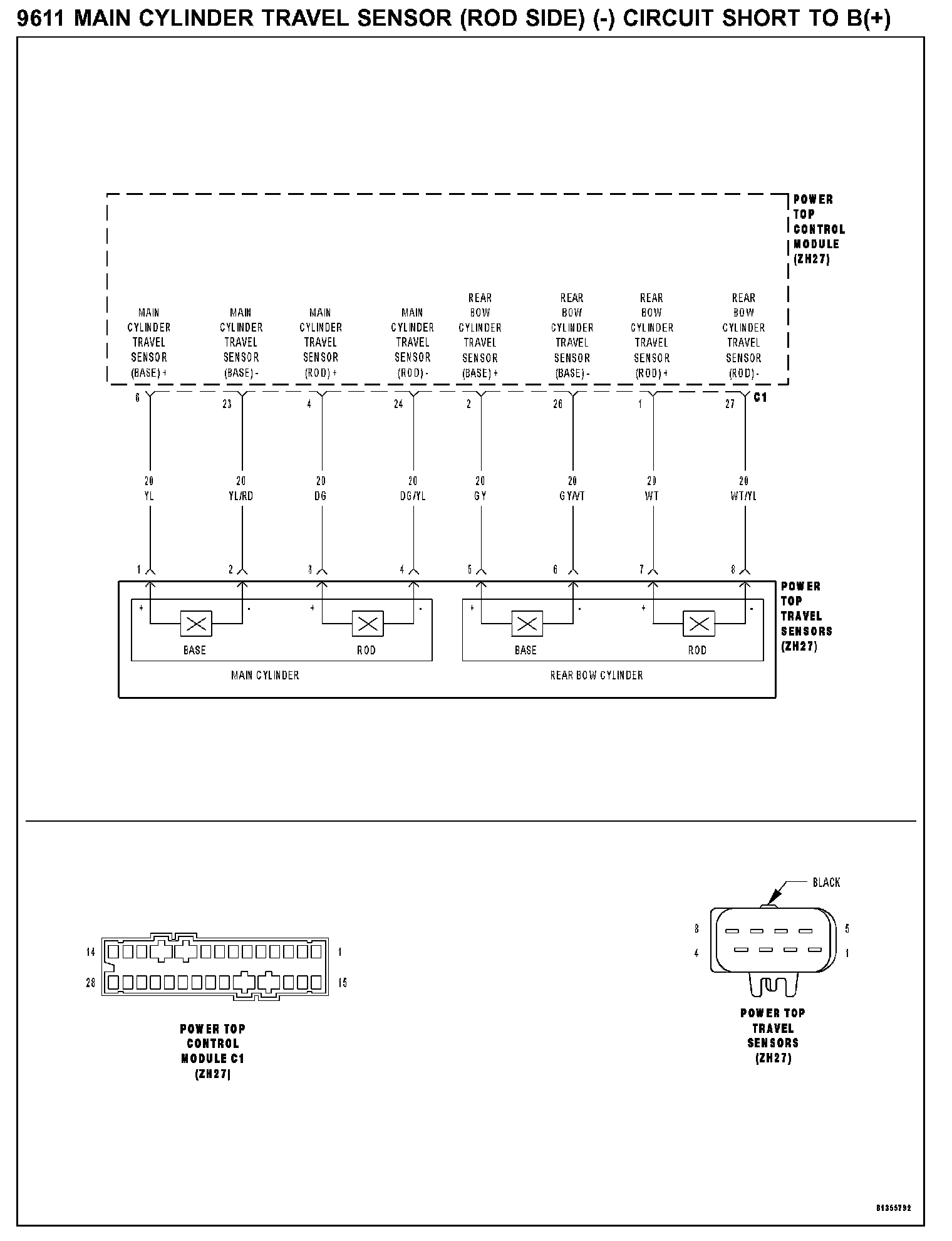 When the Power Top Control Module senses a short to B(+) on the Main Cylinder Travel Sensor (-) circuit.