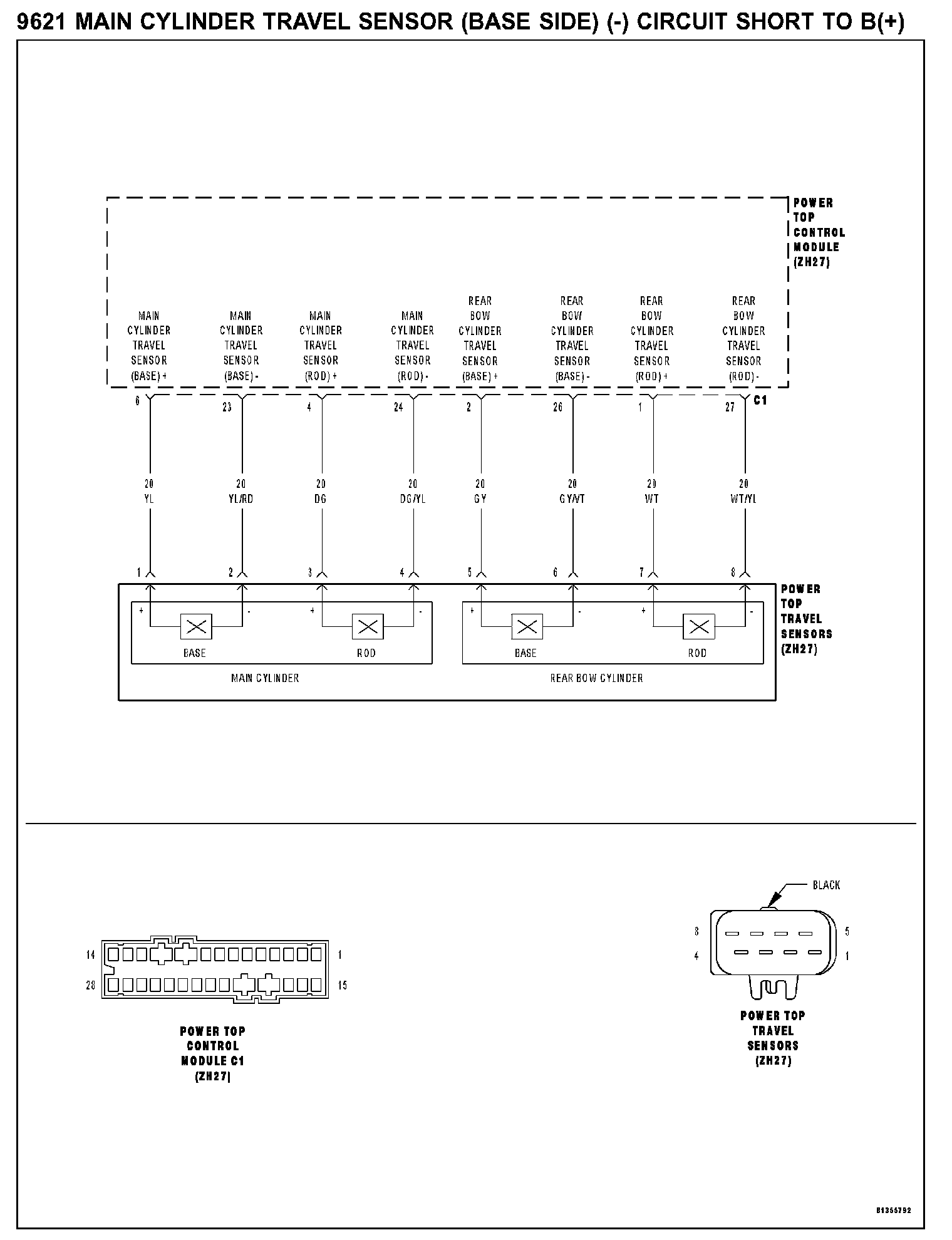 When the Power Top Control Module senses a short to B(+) on the Main Cylinder Travel Sensor (-) circuit.