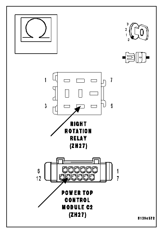 NO: Repair the Right Rotation Relay Control Circuit for a short to B(+). Perform POWER TOP CONTROL MODULE VERIFICATION TEST. Power Top Verification Test