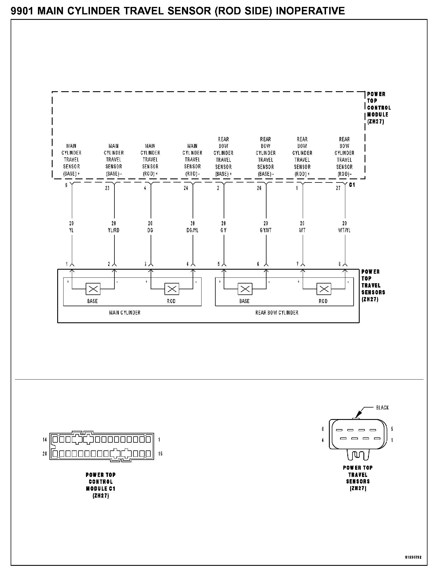 NOTE: If any other Main Cylinder Travel Sensor DTCs have been set, diagnose the other Power Top Control Module (PTCM) DTCs first before continuing.