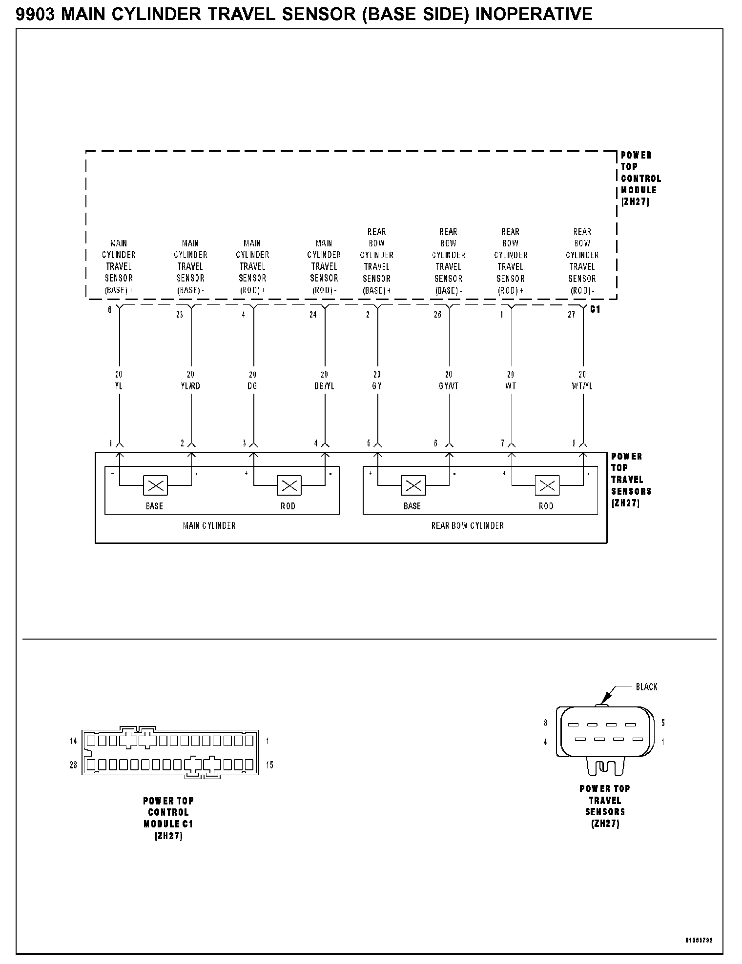 NOTE: If any other Main Cylinder Travel Sensor DTCs have been set, diagnose the other Power Top Control Module (PTCM) DTCs first before continuing.