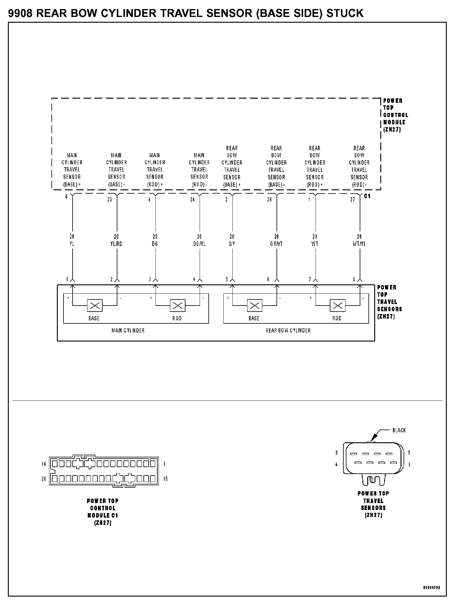 NOTE: If any other Rear Bow Cylinder Travel Sensor DTCs have been set, diagnose the other Power Top Control Module (PTCM) DTCs first before continuing.
