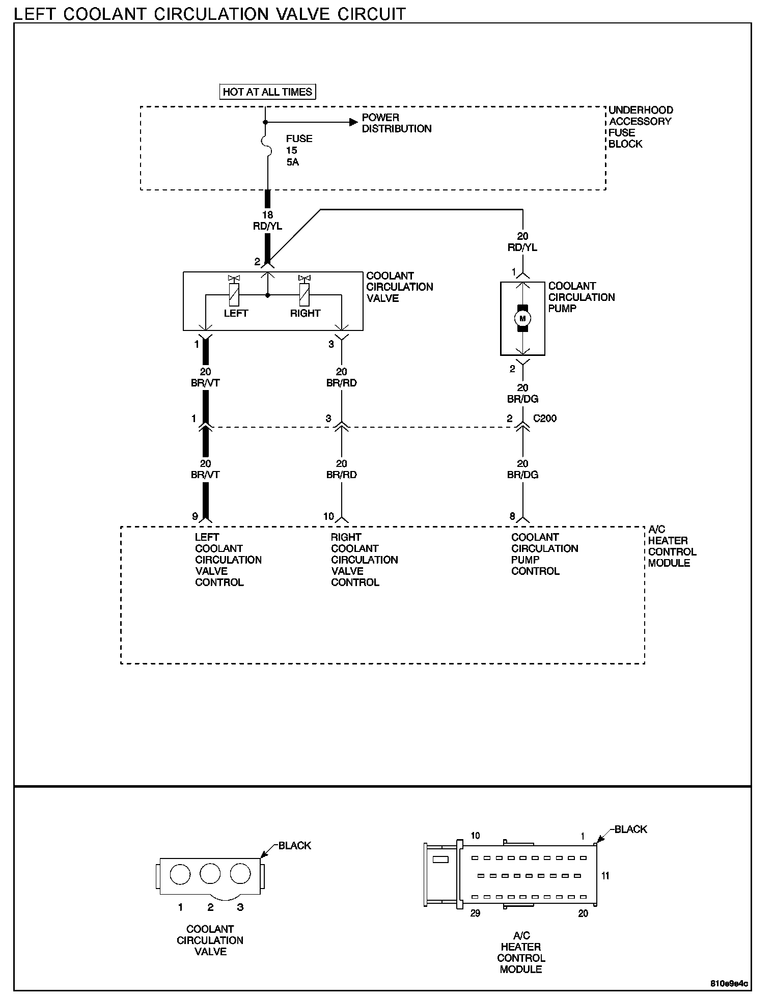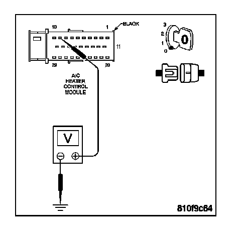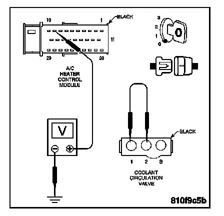 NOTE: Check connector - Clean/repair as necessary. Connect a jumper wire between the Left Coolant Circulation Valve terminals in the Coolant Circulation Valve harness connector. Measure the voltage of the Left Coolant Circulation Valve Control circuit at the A/C Heater Control Module harness connector.