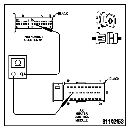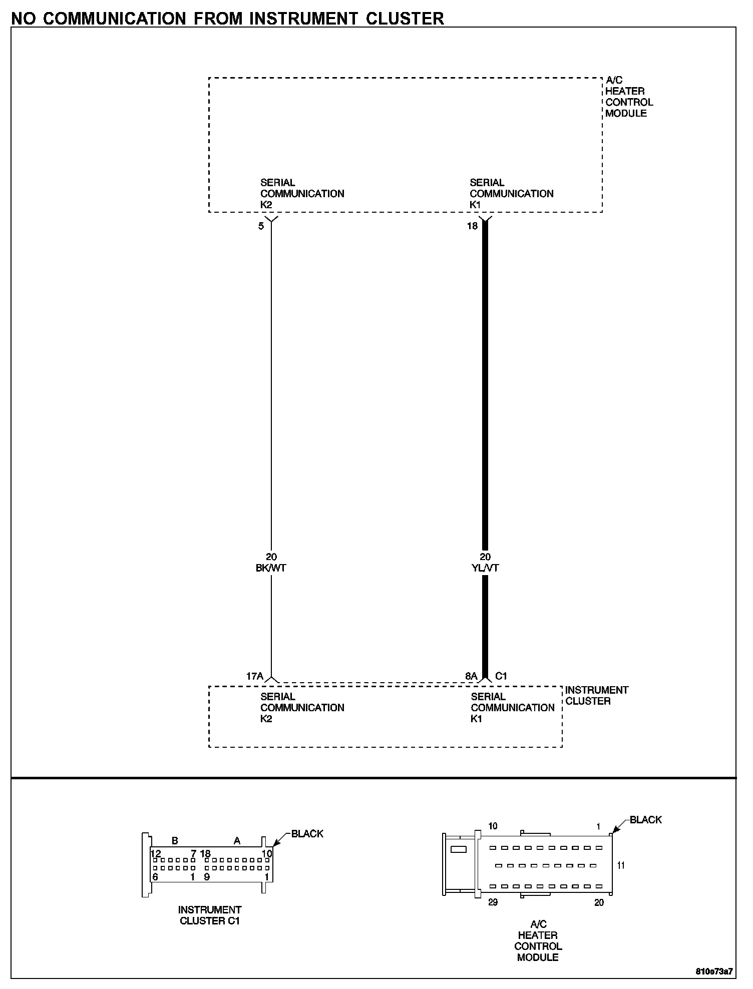 - Check connector - Clean/repair as necessary. Measure the resistance of the Serial Communication K1 circuit from the Instrument Cluster harness connector to the A/C Heater Control Module harness connector.
