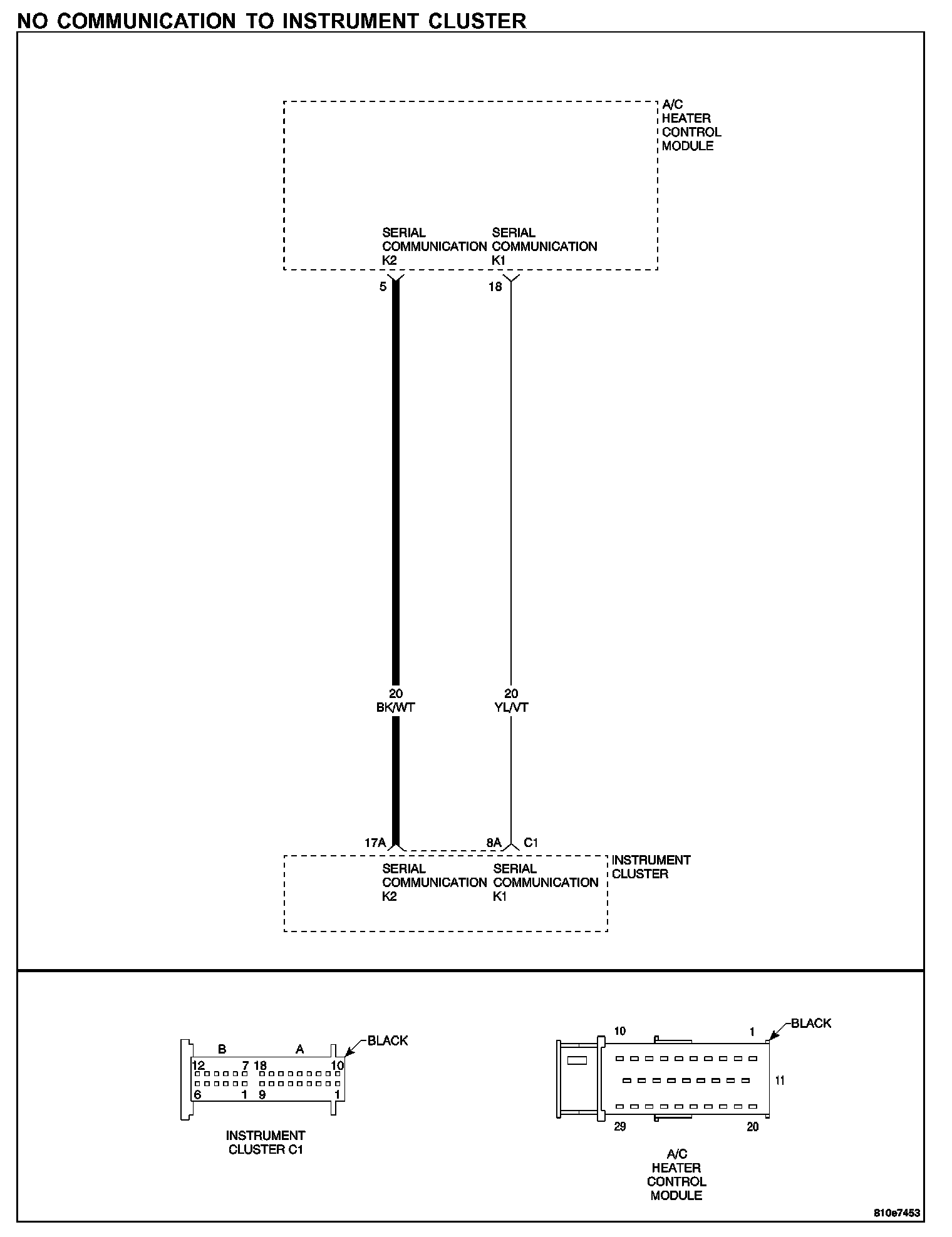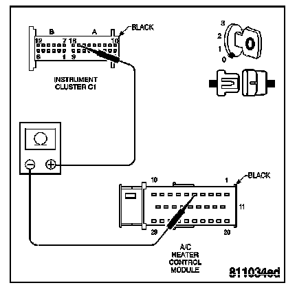 - Check connector - Clean/repair as necessary. Measure the resistance of the Serial Communication K2 circuit from the Instrument Cluster harness connector to the A/C Heater Control Module harness connector.