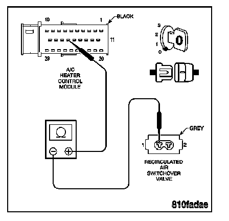 - Check connector - Clean/repair as necessary. Measure the resistance of the Recirculated Air Switchover Valve Control circuit from the Recirculated Air Switchover Valve harness connector to the A/C Heater Control Module harness connector.