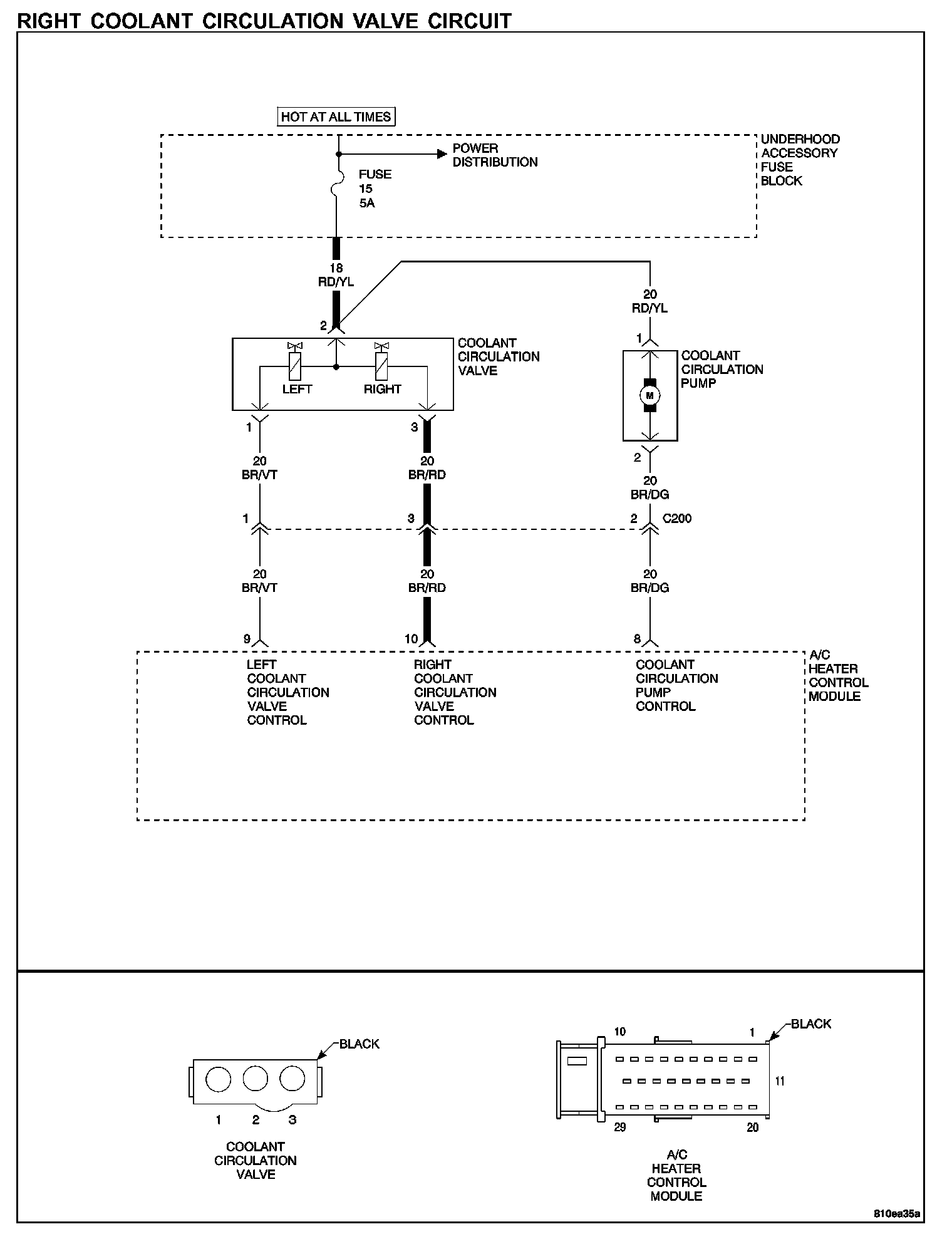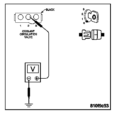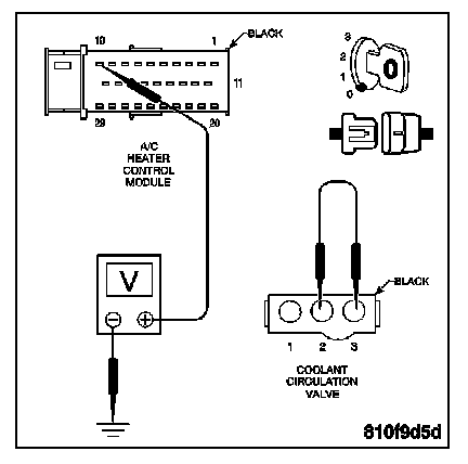 NOTE: Check connector - Clean/repair as necessary. Connect a jumper wire between the Right Coolant Circulation Valve terminals in the Coolant Circulation Valve harness connector. Measure the voltage of the Right Coolant Circulation Valve Control circuit at the A/C Heater Control Module harness connector.