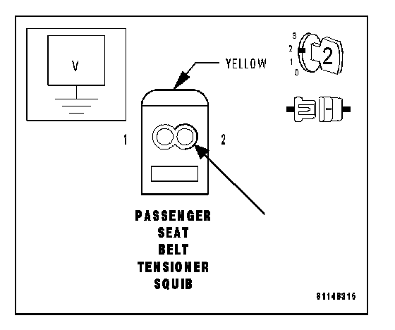 Measure the voltage of the Passenger Seat Belt Squib Line 1 circuit at the Squib connector.