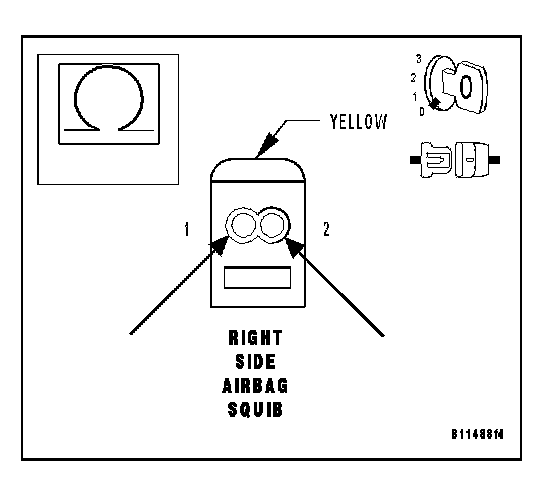 Measure the resistance between the Right Side Squib Line 1 circuit and the Right Side Squib Line 2 circuit at the Right Side Airbag Squib connector.