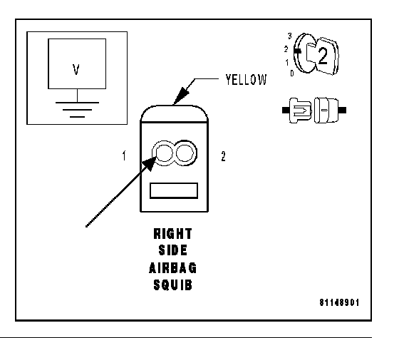 Measure the voltage of the Right Side Squib Line 1 circuit at the Squib connector.