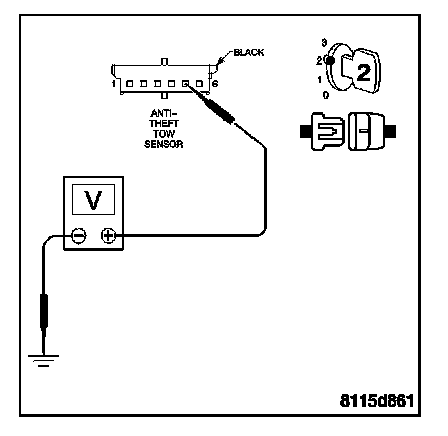Measure the voltage of the Anti-Theft Tow Sensor Signal circuit at the Anti-Theft Tow Sensor harness connector.