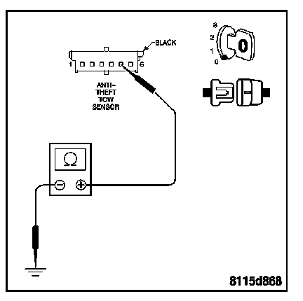 Measure the resistance between ground and the Anti-Theft Tow Sensor Signal circuit at the Anti-Theft Tow Sensor harness connector.
