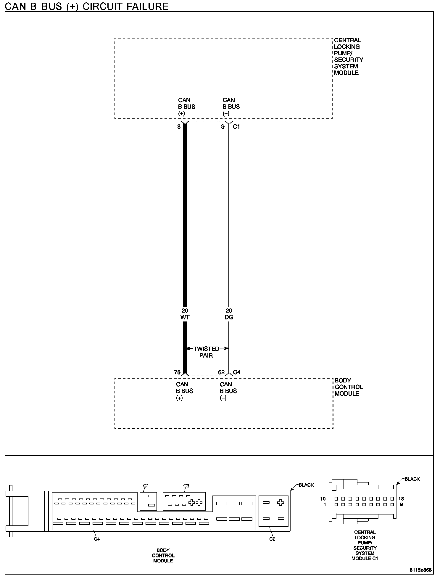 CAN B Bus (+) communication failure between the Body Control Module (BCM) and the Central Locking Pump/Security System Module (CLP/SSM).
