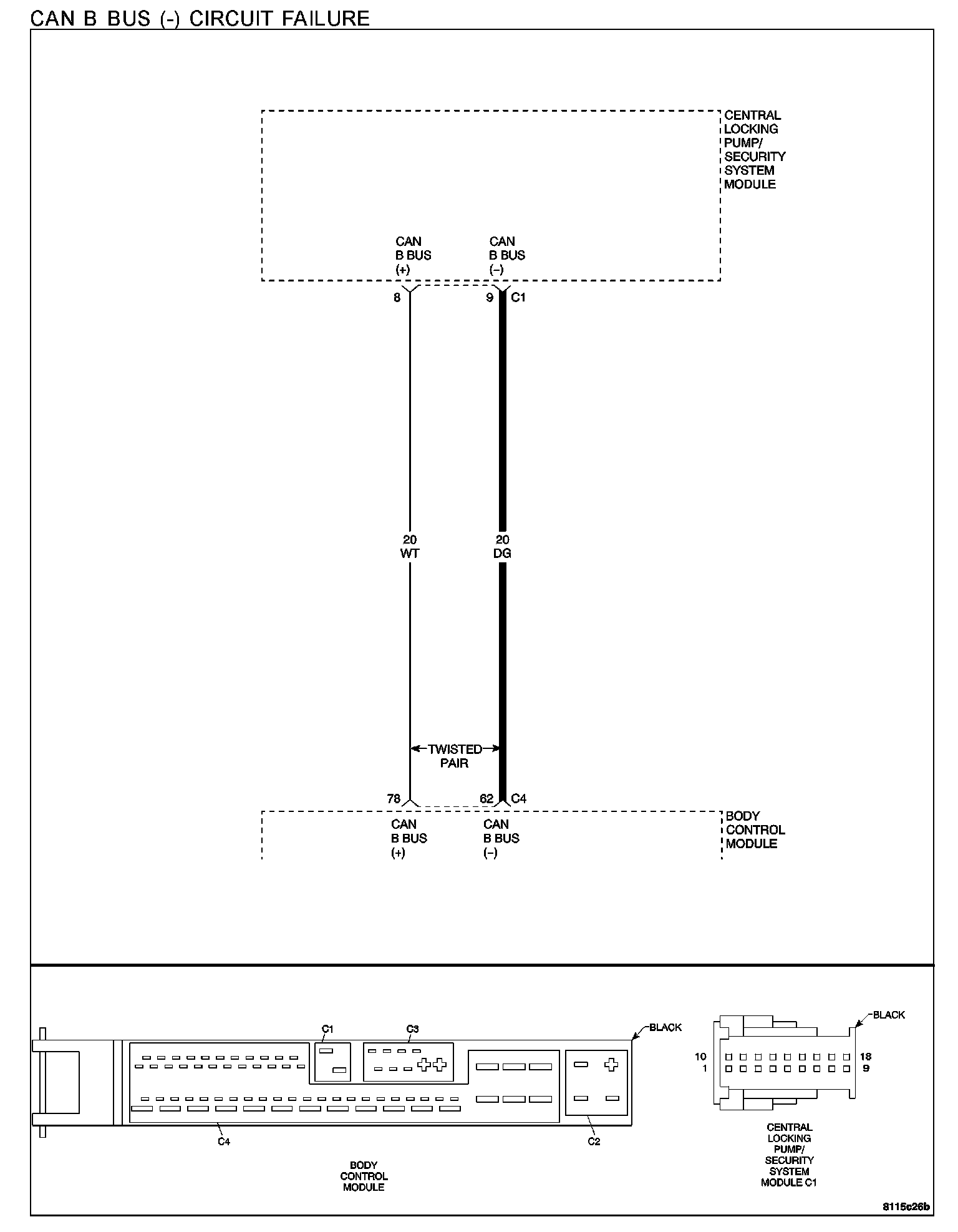 CAN B Bus (-) communication failure between the Body Control Module (BCM) and the Central Locking Pump/Security System Module (CLP/SSM).