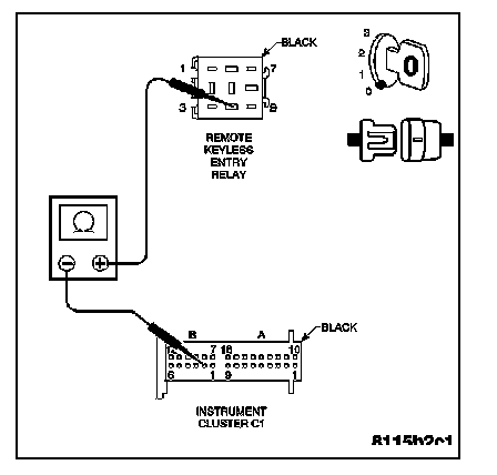 Measure the resistance between ground and the Remote Keyless Entry Relay Control circuit at the Remote Keyless Entry Relay harness connector.