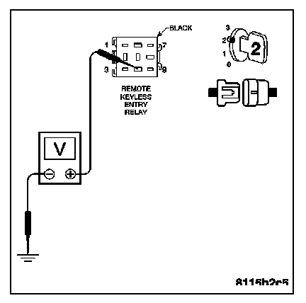 Measure the voltage of the Remote Keyless Entry Relay Control circuit at the Remote Keyless Entry Relay harness connector.