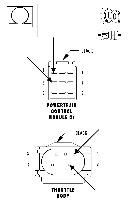 With the ignition off. Measure the resistance of the Throttle Control Motor 1 circuit from the Throttle Body harness connector to the PCM C1 harness connector. Measure the resistance of the Throttle Control Motor 2 circuit from the Throttle Body harness connector to the PCM C1 harness connector.