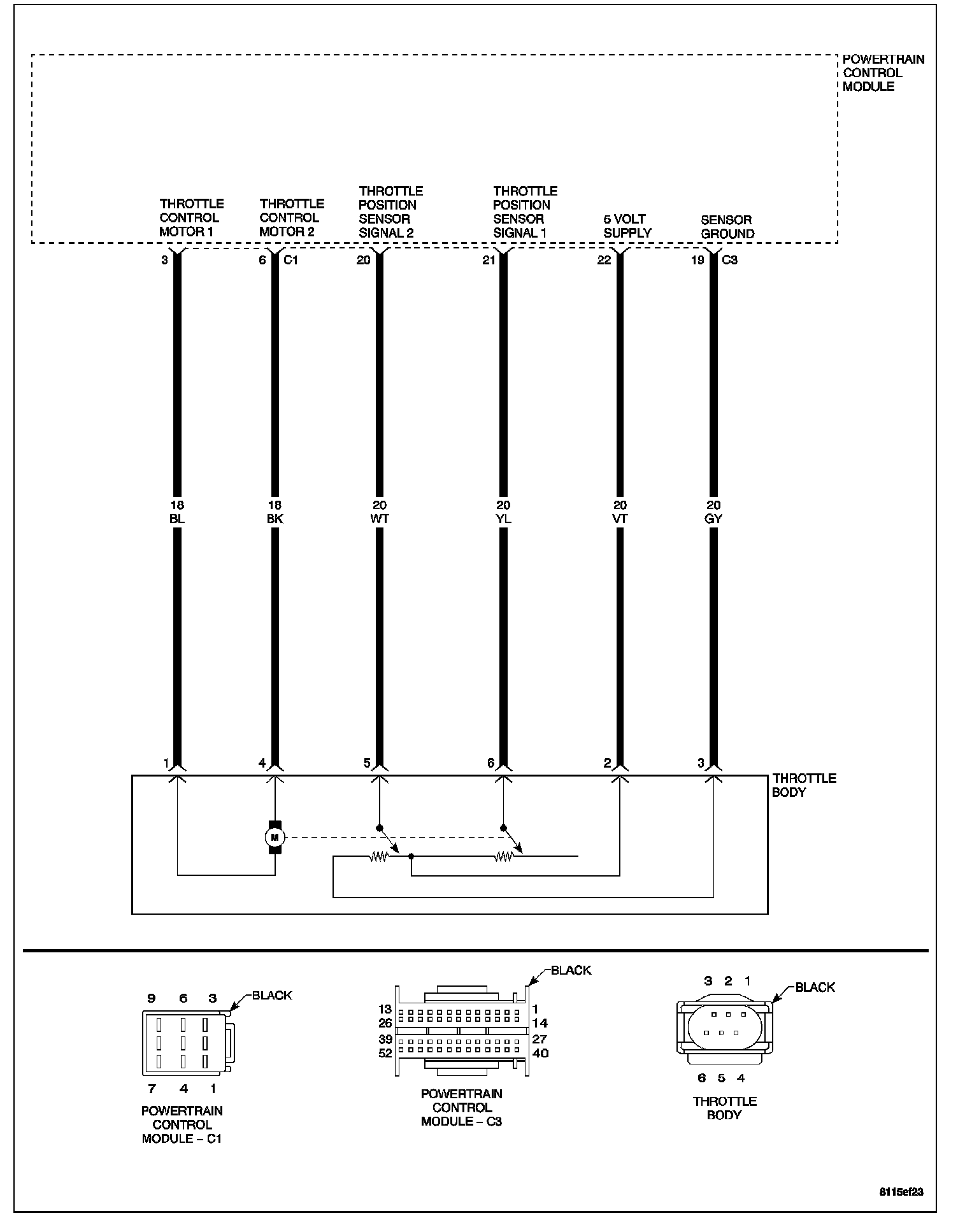 Turn the ignition off. Measure the resistance of the Throttle Control Motor 1 circuit from the Throttle Body harness connector to the PCM C1 harness connector.