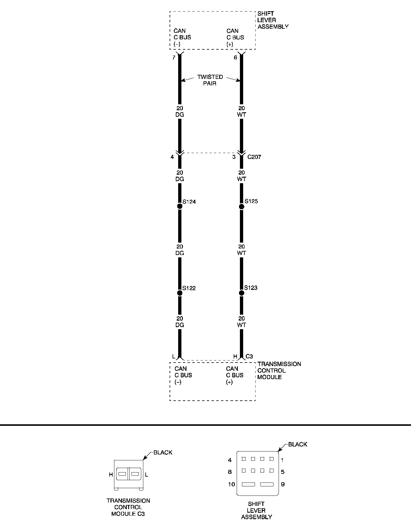 Measure the resistance from the CAN C Bus (+) circuit to the CAN C Bus (-) circuit at the Shift Lever Assembly harness connector.