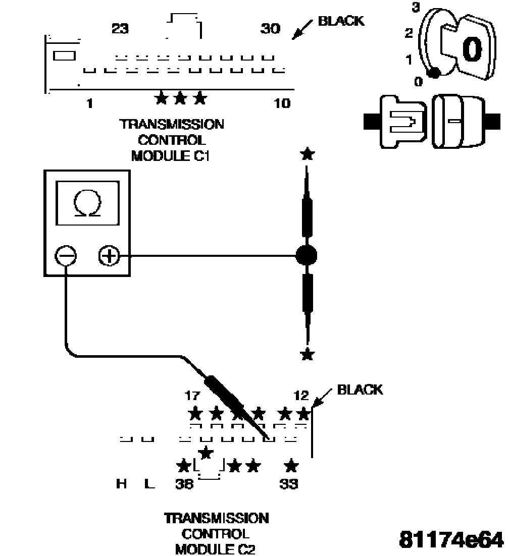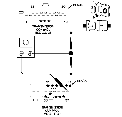 Note: Check connectors - Clean/repair as necessary. Measure the resistance from the Sensor Ground circuit to all other circuits at the TCM C1 and C2 harness connectors.