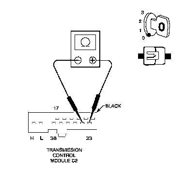 Measure the resistance between the Temp Sensor - P/N Switch circuit and the Sensor Ground circuit in the TCM C2 harness connector.