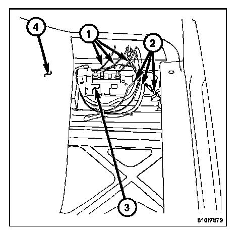 The Central Locking Pump/Security System Module (3) uses a combination of electrical wires (2) and air pressure/vacuum lines (1). The Central Locking Pump/Security System Module is located in the right rear of the luggage compartment underneath the trunk floor covering (4). It is wrapped in a sound deadening material in order to operate quietly without disturbing the vehicle operator.