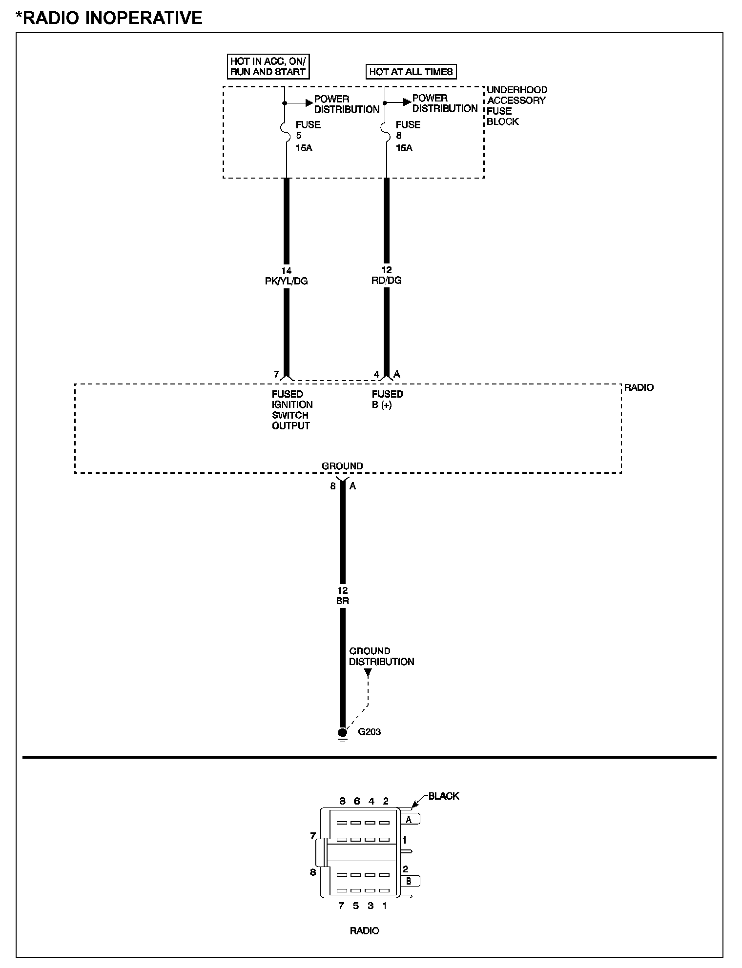 Measure the resistance between ground and the Ground circuit at cavity 8 (connector A) of the Radio harness connector.
