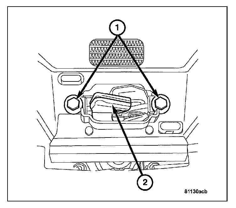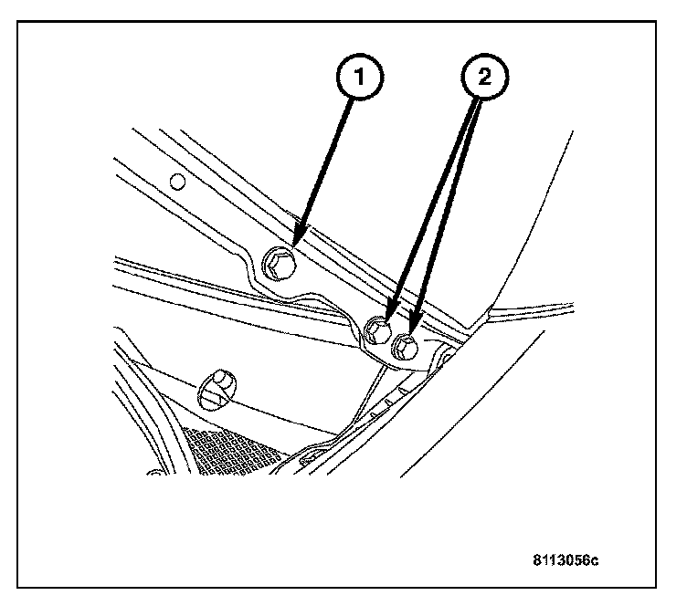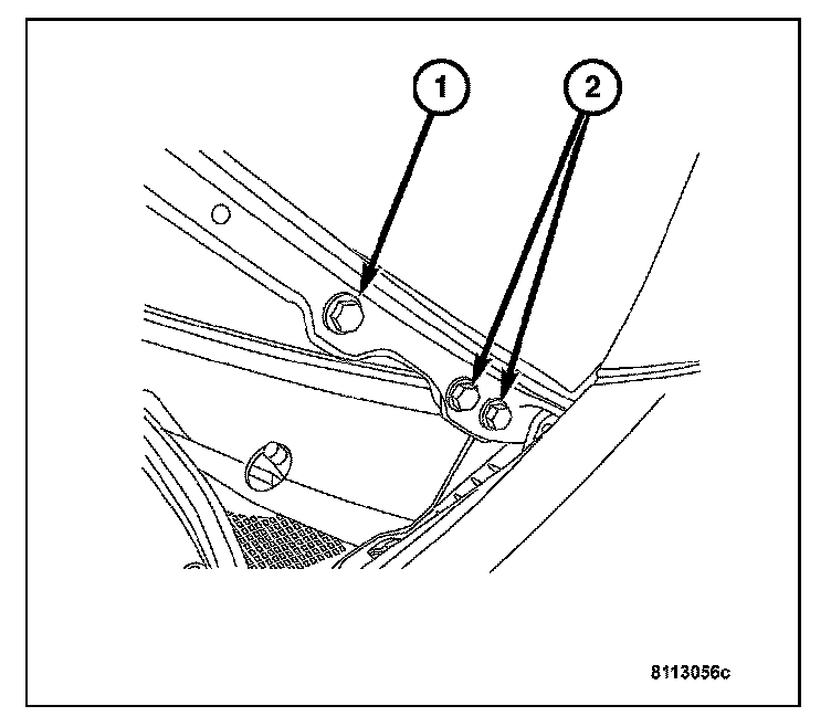 1. Loosen the bolts (1) on the top section of hood latch (2).