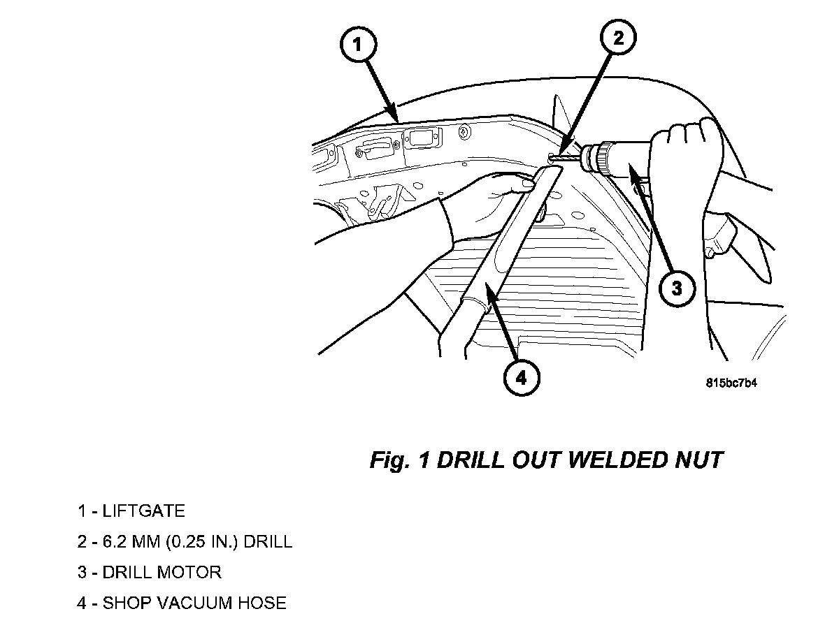 2. Using a drill motor with a 6.2 mm (0.25 in.) drill, drill out the welded nut.