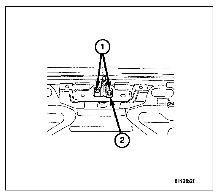 2. Remove the bolts (1) attaching the striker (2) to the vehicle.