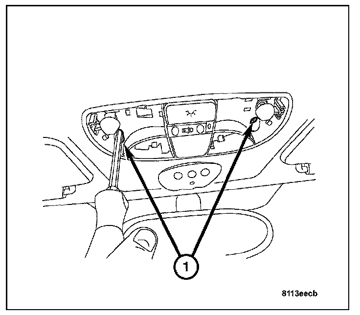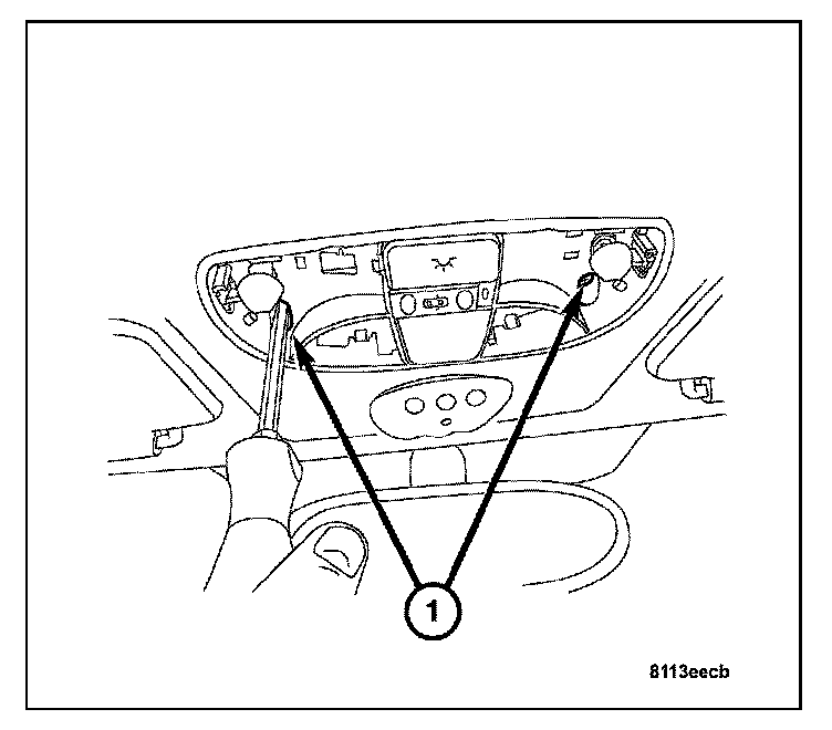 2. Remove the two retaining screws (1) and pull the dome lamp assembly from the headliner.