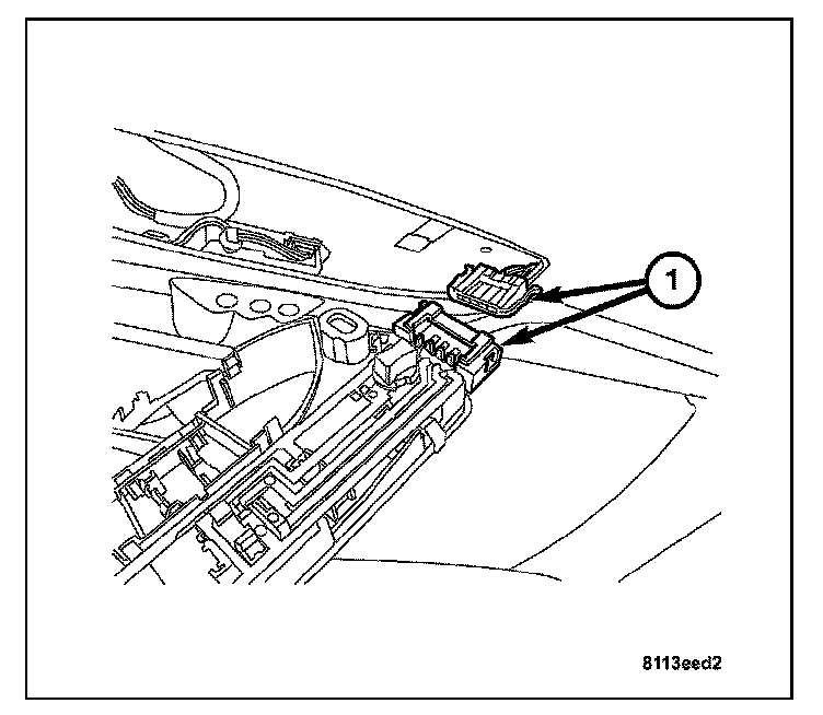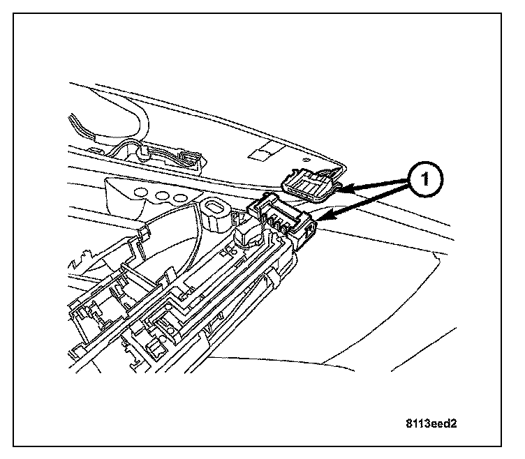 3. Disconnect the dome lamp assembly harness connector (1) and remove the dome lamp assembly.