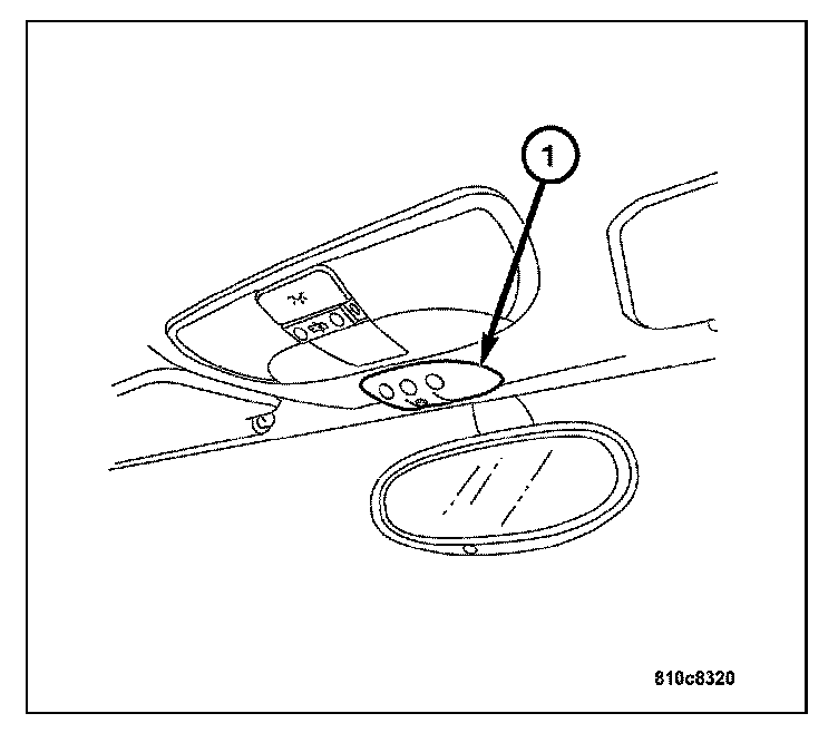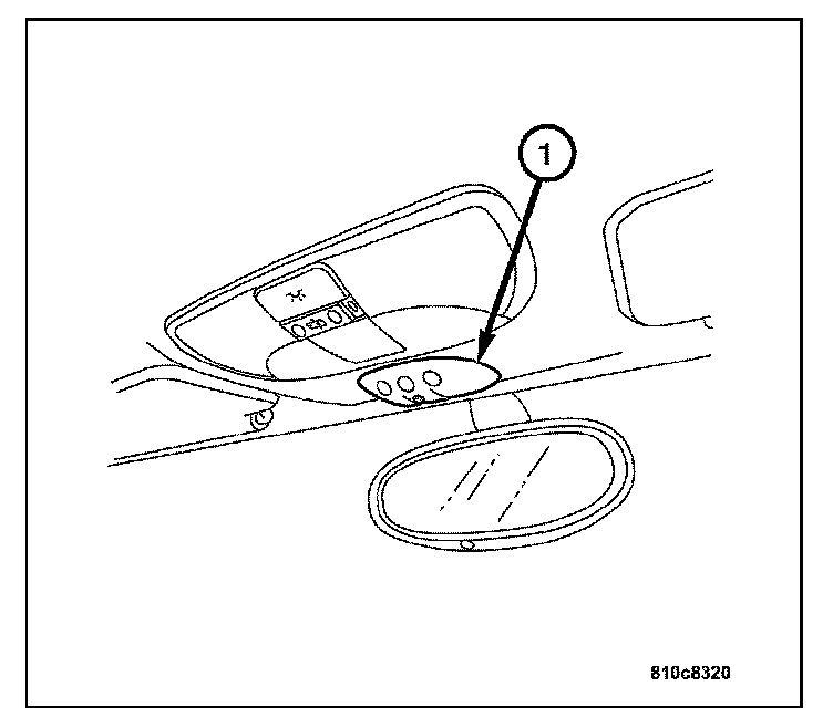 4. Remove the universal garage door opener/TPM module (1) from the headliner using a trim stick or equivalent. Pull the module from the headliner and disconnect the harness connector.