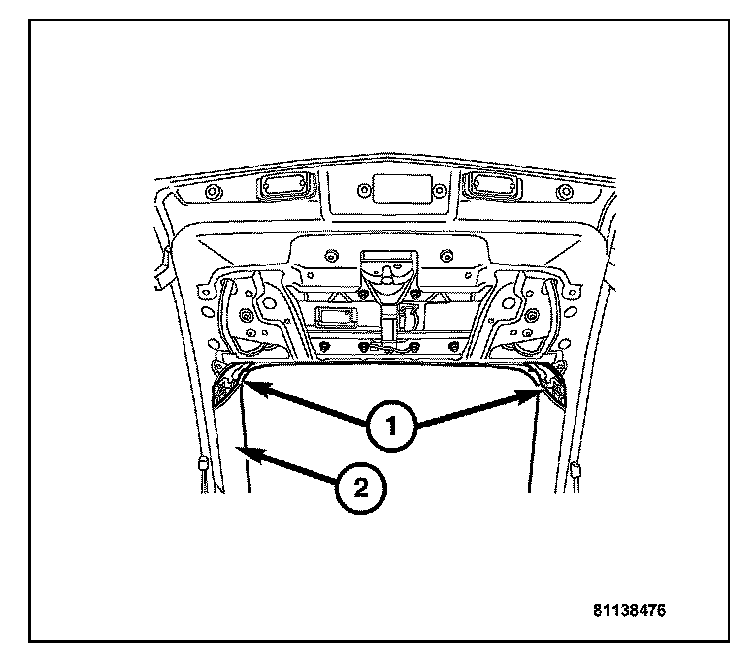 2. Remove the two screws (1) attaching the upper liftgate trim panel (2) to the liftgate.